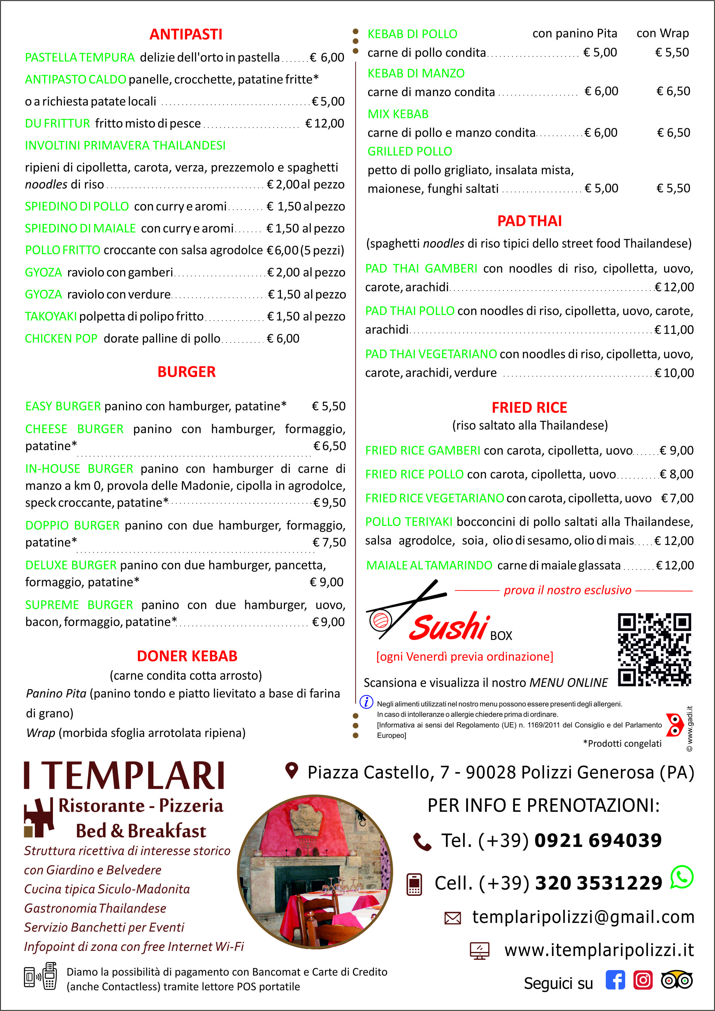 Menu da Asporto Creato: 20 Aprile 2020 | Ultima modifica: 27 Luglio 2024 Scritto da Super User Categoria: Uncategorised Cliccate sulle foto sottostanti per visionare il nostro Menu Pizzeria e Rosticceria da asporto e con consegna a domicilio >>>> Oppure cliccate direttamente quì per potervi scaricare sul vostro dispositivo multimediale il nostro Menu <<<< Ricordiamo alla nostra gentile clientela che oltre al SUSHI, su richiesta realizziamo piatti originali THAI FOOD come da tradizione della tipica cucina Thailandese, da asporto o con consegna a domicilio gratuita.